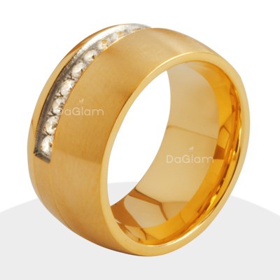 Anillo de acero pulido esmaltado en dorado en diseñod e círculos unidos.