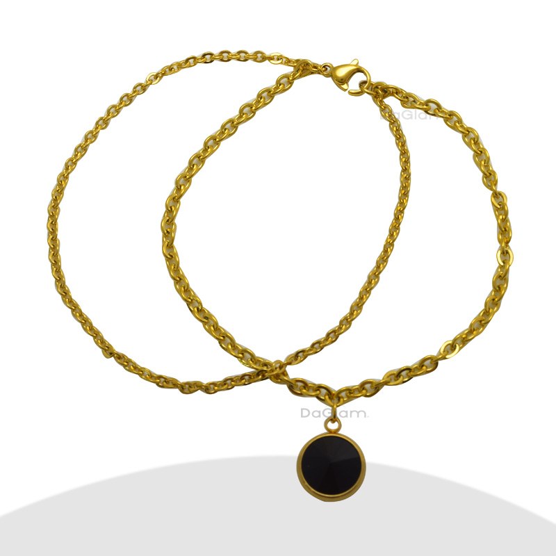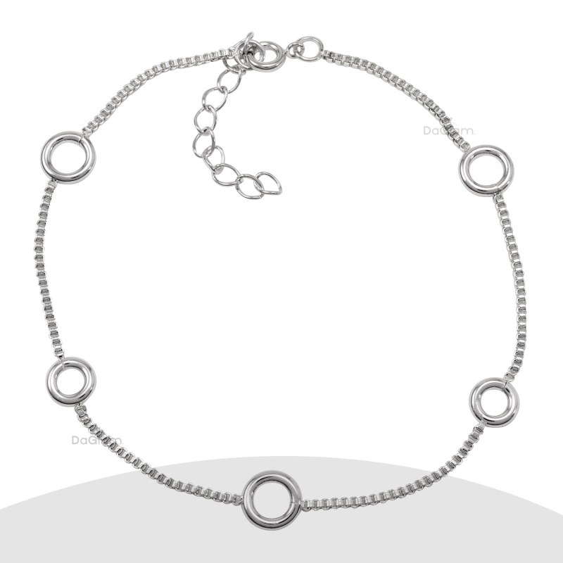 Pulsera de acero hecha con una cadena de eslabones y círculos colgando de ella. Largo 19 cms